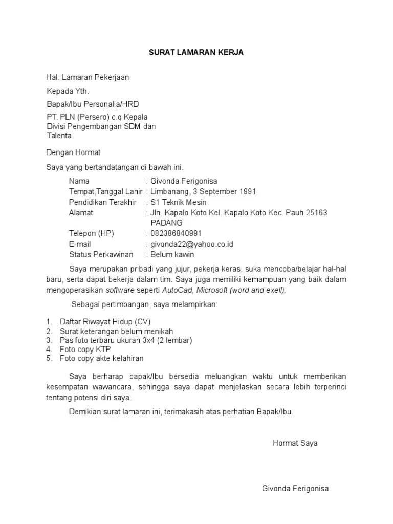 15 contoh surat lamaran kerja bumn pt pln semua posisi jaminan. Besar harapan saya untuk bisa bergabung dengan pt pln persero di berbagai wilayah yang ada di indonesia. Contoh surat lamaran kerja perusahaan bumn pln resmi yang baik dan benar pt pln persero adalah salah satu perusahaan bumn terbesar dan . Dari website resmi pln terkait lowongan kerja di pt pln persero maka . Berikut contoh surat lamaran untuk lulusan baru: