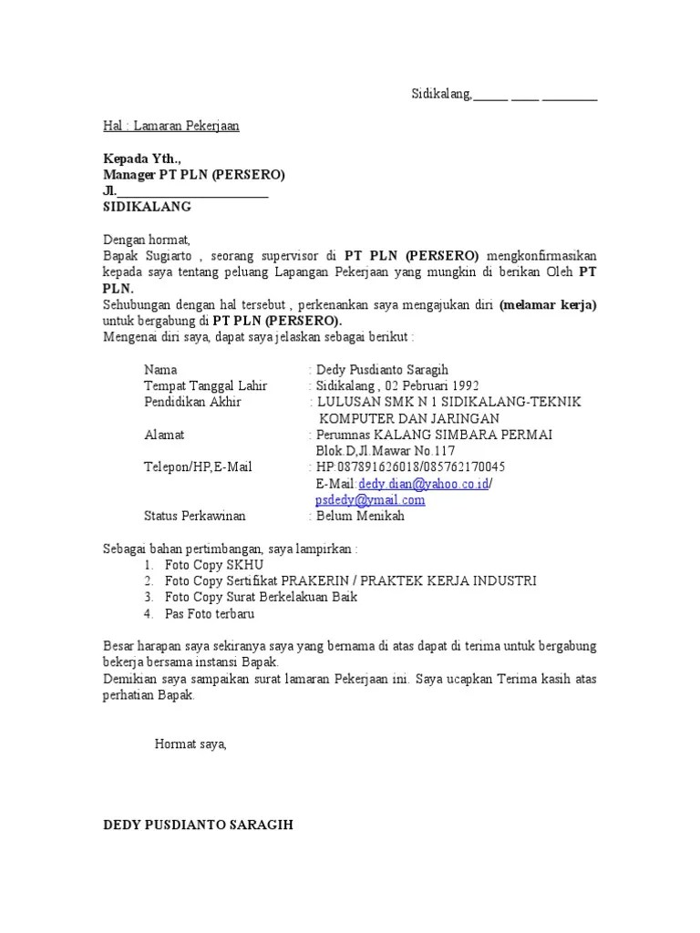 Demikian surat lamaran yang saya buat, besar harapan saya untuk bisa lolos persyaratan administrasi dan dapat bergabung menjadi karyawan di pt pln persero .